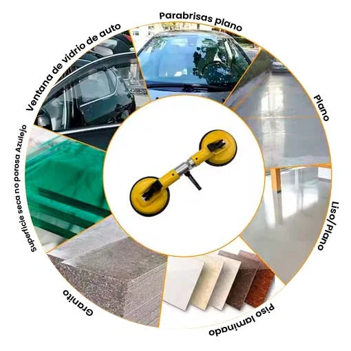 • Diámetro de ventosas: 12 cm cada una • Carga máxima: hasta 80 kg • Material: aluminio + ABS reforzado • Mecanismo: manivela central para nivelación • Peso: 1.5 kg aprox. • Compatible con: mármol, vidrio, porcelanato, baldosa pulida, granito